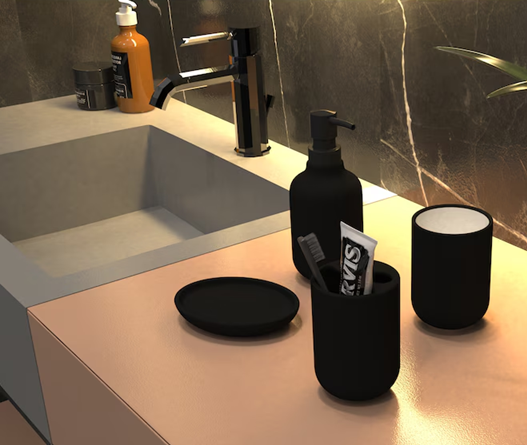 4-piece ceramic set: Upgrade your sink game with this 4-piece ceramic bath set that’s as stylish as it is functional. Wrapped in a grippy rubber shell for that “ahh, this feels nice” touch, each piece brings just the right amount of charm to your bathroom vibe—whether you’re going for modern, cozy, or somewhere in between. Made from eco-friendly stoneware ceramic (because we care about the planet and your shelfie), it’s smooth, durable, and super easy to clean—just wipe and done. No sharp edges, no fuss—just good design.